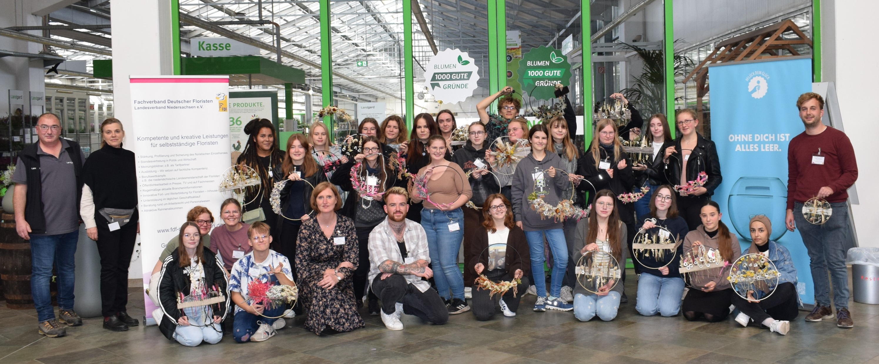 Achtundzwanzig Auszubildende des ersten Ausbildungsjahres Florist*in, folgten am 11. Oktober 2023 der Einladung des niedersächsischen Fachverbandes zum Azubi Start Up, das maßgeblich von der FDF-Vize-Präsidentin Brigitte Feldkamp organisiert wurde.